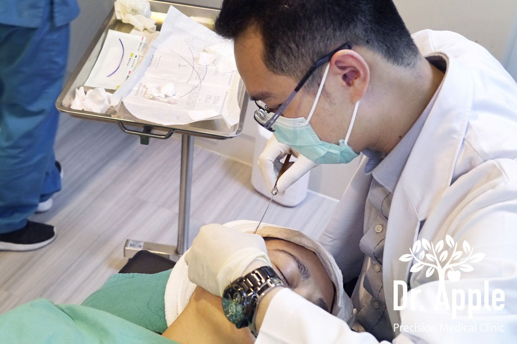 在經由姚醫師的專業問診,並且在不動刀的顧慮之下,April接受的是台灣近年相當流行的抗老治療;埋線拉提。所謂的埋線拉提,即是將可吸收縫合線羽毛線 PDO (polydioxanone)埋入皮膚中,固定在面部的筋膜,其倒鉤設計呈螺旋狀走向,可以 360° 拉提皮膚組織的各個面向,像是懸吊系統的支架,將鬆弛的肌膚集中拉提,不僅效果立即可見,療程本身也因不必開刀,傷口小,所以感染風險低,且不需長時間的恢復期。