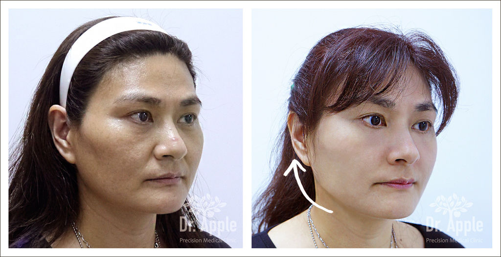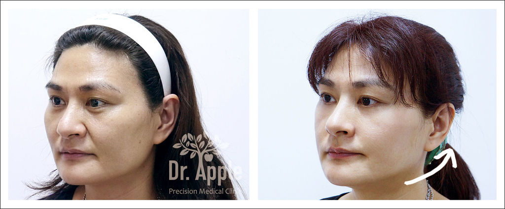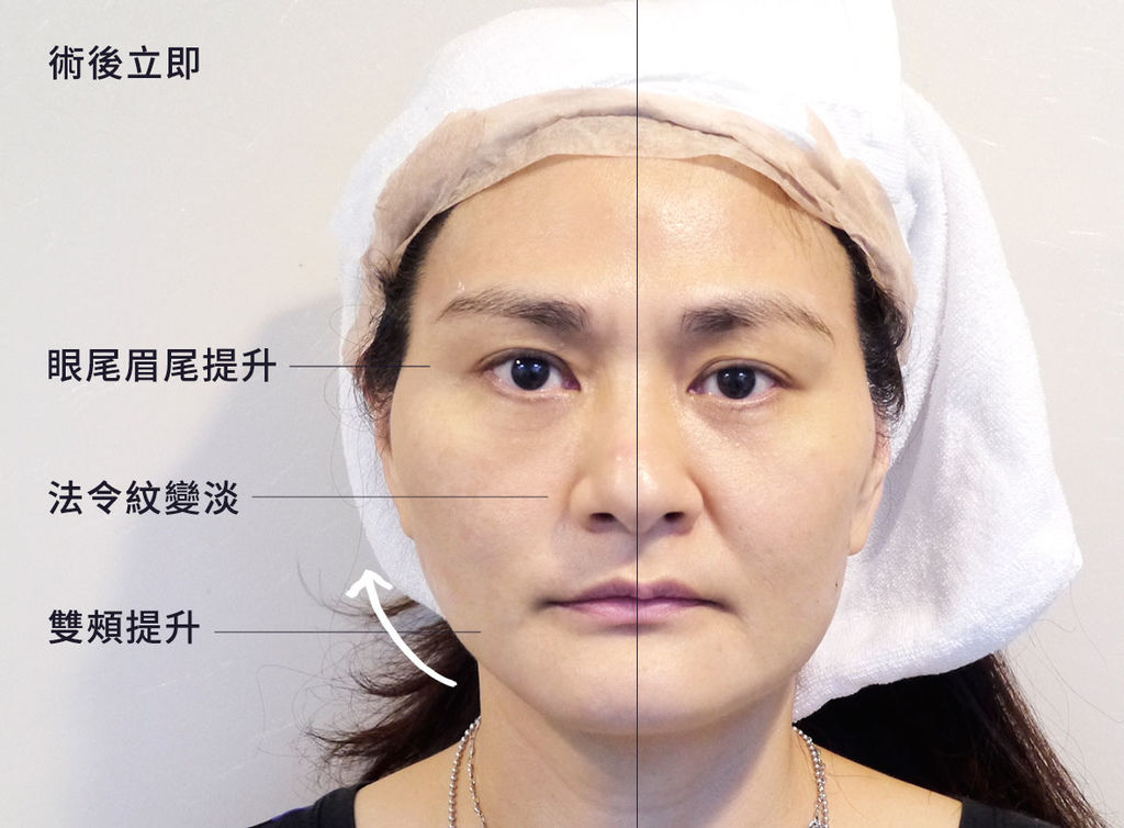 在姚醫師經驗豐富的操作下,剛結束療程的April,從臉頰、眼尾到眉尾,都已經有顯著的拉提提升,而法令紋也在支架補強後,因為被從兩側拉撐而淡化,所有效果在術後立即可見。只是一點些微的調整,神態卻判若二人,臉蛋變年輕的April不只是改善外表,就連長年操勞的頹態,也隨著外觀、自信的提升而淡化。